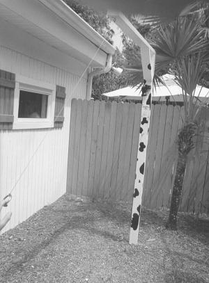 The post, painted "cow white and black", was about 8 ft. tall with a horizontal piece on top sticking out about 4 ft. There was a large metal hook screwed into the post about halfway up and a metal ring about 2 in. dia. hanging on a string from an eye hook screwed into the horizontal piece up above. The string holding the ring was just long enough so the ring could catch on the hook. The object of the game was to stand back away from the post and swing the ring so it would catch on the hook.