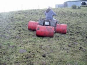 Because it's wet so much of the time in winter it's normally very difficult to get on the land to repair the damage, he says. A conventional tractor gets stuck easily on the soft ground and a pull-type roller can drag loose soil in front of it, clogging, "and it's really frustrating."