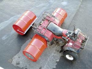 "For the rear, center drum, I normally put 35 liters of water directly in it, using the existing plug. It's not as heavy because it doesn't have any weight from the ATV, so if you want more weight, you just add more water," he explains. Rivers is working to develop a modified system that would be a "one-size fits all ATVs" unit.