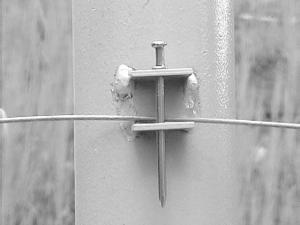 To hold the wire in place on the clip, Baker uses a double-headed nail that sticks up above the clip so you don't have to take off your gloves to lower the fence. Insulators can also be added on electric fence.