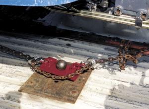 It consists of a couple pieces of 1/2-in. thick plate steel that fit on either side of the ball hitch and hook together with a lynch pin. There's a heavy chain hook on either end of the clamshell to hook to chains or ropes that tie the load down.