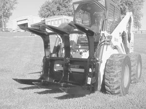 The "Gregory Grappler" is designed for skid loaders with a minimum of 40 hp. It's made from high tensile, 1-in. thick steel. Both the upper and lower forks are hardened and gusseted for extra strength. The forks pivot on a 2 1/2-in. dia. shaft inside a machined and greasable bushing.