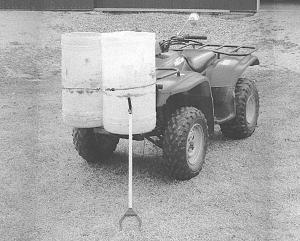 I strapped two 15-gal. containers on front of my ATV, along with a æpick stick.' I use the items to pick up litter in ditches along township roads and also along some county and state highways. When working along state highways I pull a small trailer behind to store the litter. The containers are held on with rubber st..........