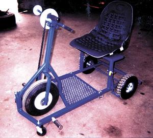 The rig's seat is low to the ground and swivels to either side, making it easy to get on or off. A pair of plastic knobs can be used to adjust the seat forward or backward. There's a basket on back for carrying extra stuff. The entire rig comes apart in three pieces for easy loading, (Harold Fratzke, 234 Shoreview Dr., Cottonwood, Minn. 56229 ph 507 423-6341)