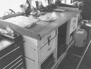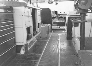 Gordin, who bought the 1991 model bus for $2,400, totally remodeled the interior. On one side of the bus he installed a gas engine-powered air compressor, a 7-ft. long workbench, a roll-around toolbox, and a welding torch and acetylene tank. On the other side of the bus there's a 50-ft. air reel, 4-drawer bolt bin, electric-operated grinder, and a 110 and 220-volt AC/DC Hobart welder-generator. Each side of the bus is wired with three 110-volt outlets, eliminating the need to run an extension cord from tools to the generator.
