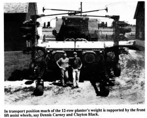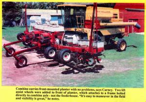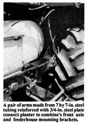 "I got the idea because I needed a bigger planter and didn't want to spend the money for a tractor to pull it," says Carney, who built the "combine-planter" with the help of brother-in-law Clayton Black. "I had been using an IH Early Riser 6-row no-till air planter and traded it in for the 198712-row semi-mount. A new tractor big enough to pull it would have cost at least $50,000. My new combine cost about $130,000 so I decided to make it do double duty. I spent about $2,500 to modify it to carry the planter. I was familiar with both the planter and combine, but it took quite a bit of head-scratching to figure out how to match them up. However, people who see it are surprised at how simple it is. I didn't have to modify the planter much or do any welding on it."