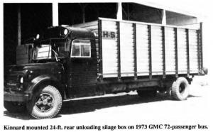 Rod Kinnard has been turning school buses into self-unloading wagons for over 25 years. His latest self-propelled wagon was built from a 1973 GMC 72-passenger bus equipped with a 5-speed transmission. He mounted a 24-ft. rear unloading H & S silage box on it.