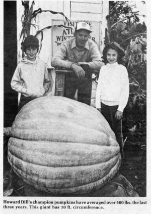 Dill's "biggest ever" world champion Jack-O-Lantern measured 30 in. high, 44 in. wide, and 43 in. long. Circumference was 10 ft. and its rate of gain during the growing season was 8 lbs. per day! "The pumpkin actually weighed 493 1/2 lbs. when picked in early October but shrunk to 469 lbs. by the time it won the competition last fall," says Dill.