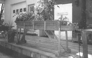 The treated wood "deck garden" is 8 ft. long, 42 in. high and 12 in. wide. Kunkle used a lathe to shape its wheels and added a fold-up tongue at one end. "It can be used to pull the unit around or make the front wheels turn corners," he says.
