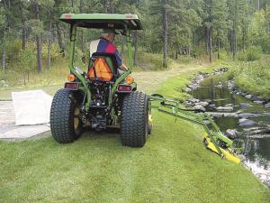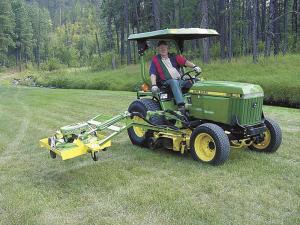 Joyce uses the side mount mower on his Deere 955. It lets him extend a 22-in. push mower as far as 4 ft. out to the side of his tractor.
