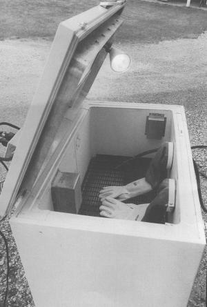 He cut a pair of 6-in. dia. arm holes spaced 15 in. apart at the front of the freezer and fit two coffee cans extended thru and extending extra 1 1/2 in. inside. He bent the outside edges of the cans flat and riveted them to the freezer.