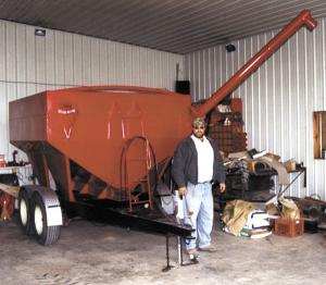 I built this bean buggy out of an old fertilizer buggy. I put in a new floor, sloping everything to the center. Then I installed a folding auger from the left front corner down to the center of the buggy bed, to which seed naturally flows. The auger is hydraulic-operated. (Brent Pitcher, Montrose, Ill. ph 217 924-4248 or 217 276-4248)