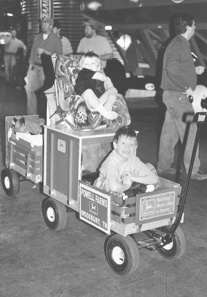 "We've been using this setup for five years - Jonathon was only one year old when we bought it," says Johnny. "We bought the wagon from an Amish man who exhibits at the show. My father-in-law and I added the box. Our double wagon is handier than using two strollers and it has a lot more storage room. We paid $160 for the 4-wheeled wagon and $75 for the 2-wheeled wagon."