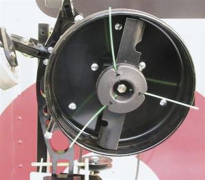 The trimmer head mounts below the blade. The high lift blade creates a vortex that sucks grass up into the trimmer lines.