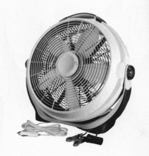 The 2-speed, 12-volt fan comes with battery clamps, allowing you to hook it up directly to any battery terminal, and with a 12-volt plug-in adapter for cigarette lighter outlets.