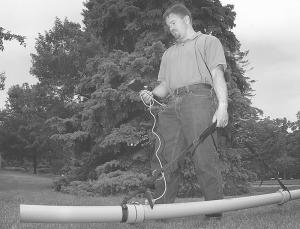 The instrument, called a non-invasive electromagnetic induction (EMI) sensor, consists of a hand held data reader connected to sensors in an 8-ft. long pipe. To gather data, the pipe is carried across and parallel to the surface of the area in question.