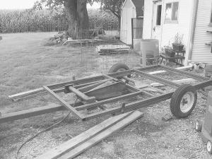 He got the trailer from his brother-in-law. The floor was rusted out so he removed it. He used 2-in. sq. tubing to build a 5 by 9-ft. frame on top of it and hinged it at the back. He rebuil
