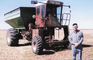 "It's highly maneuverable which makes unloading into a semi truck a much easier job. It also frees up a tractor," says Noel Hicks, Palmyra, Ill., who built a self-propelled grain cart out of an International Harvester 1480 combine with a 650-bu. Brent grain cart on back.