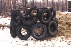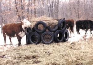 "It's a good use for old tires, and all it cost me were a few bolts and washers," says Siemers. "I can move it easily with the tines on my loader-mounted bale fork. The tires are bolted so tightly together that they stand upright without any additional support. In fact, I made a tire feeder for horses that doesn't have a pipe frame on top at all. It works great because there's nothing in the way for horses to rub their manes out. The horses can bend the tires over, but the tires always come right back up. You could drive a post or two next to the feeder and attach it to the tires to keep the sides from bending.