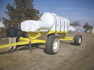 The trailer is equipped with a 300-gal. tank that holds liquid starter fertilizer to apply in the row. Liquid nitrogen is carried in a 1,000-gal. tank and is applied beside the row.