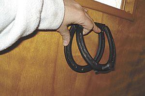 Horseshoe Bookends FARM HOME Novelty Items 32-1-41 My husband likes to make stuff out of old horseshoes. To make bookends, he welds two horseshoes together at a right angle and then spray paints them. To make a bridle hook or coat hanger, he cuts a horseshoe in half and welds it on front of a complete horseshoe. You can hang whatever you want from it. To make a door knocker, he welds the open end of two horseshoes to a door hinge and then welds a nail onto the bottom end. Other ideas can be found on our blog site. (Dora Renee Wilkerson, bricore@roadrunner.com; blog: bricoreandfamily.blogspot.com)