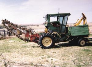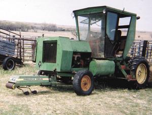 He started with an old retired Minneapolis Moline combine and used the cab engine power steering and hydrostat transmission He added an old John Deere drive and front axle and a 4-speed transmission from a Studebaker to get seven speeds and the ability to drive slowly He used the transmission and clutch assembly from a 1948 self-propelled Cockschutt combine to operate the digger chains on the Ditch Witch attachment on the back