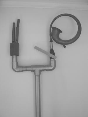 He bought the old horn at a flea market and uses a portable, compact shop vacuum to power it. The vacuum sits in his basement, with a 1 1/2-in. dia. pvc pipe connected to the "blow end." The pvc pipe brings the air up from the basement, through a hole in the porch floor, and to the home-built whistle through a manifold made from a 2 by 2 by 3-in. block of wood with holes drilled in it.