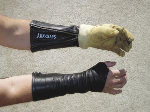 Arm Chaps sell for $36.95 and come in eight sizes from children's to large adult. Besides standard black leather, Arm Chaps will soon be available in a skin tone tan and safety blaze orange for hunters. Another option is a non-metal zipper for power line workers.