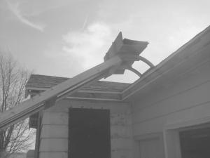 Dietsch used rollers usually attached to a garage door to mount a small wooden platform on the tracks and attached the elevator chain to it as well. He also mounted an axle with lawn mower wheels to the base for easier moving. At the roof end, he attached a pair of metal feet to lift the elevator above the roof edge and rain gutters.