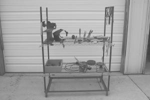 The cart rides on four caster wheels and measures 48 in. long by 24 in. wide, with 60-in. long, 1-in. pipes used for the legs. The base of the cart is made from 1 by 1 1/2-in. angle iron and is handy for storing scrap metal. The shelves Kornkven used have round metal sleeves at each corner, which made it easy to mount the shelves on the pipes. He used split ring collars for the shelf supports, which allow him to raise or lower the shelves as needed.