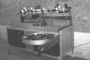 "The can holders on top of the bench are made from an old driveshaft chopped into metal rings, with a rod underneath supporting the bottom of the cans. Holds the cans securely when moving the bench. There's even a magazine rack with a zip-up notebook in the knee hole for storing operator's manuals."