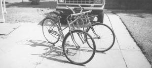When he stopped by a local bike shop and told them what he wanted to do, they donated two old bikes to the cause. Parris cut the frame behind the steering posts and removed the handlebars on both. At the same time he removed the front wheel from his bike. He also removed the wedge from the handlebar connection to the frame so it "free wheeled."