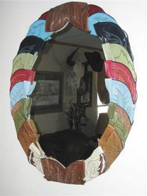 The 19-in. dia. circular mirror is lined with overlapping boot tops in many different colors and styles. It takes about eight pairs of boots to make a 19-in. dia. mirror.