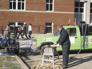 Along the way, gas from the wood was also used to power the genset. Keith simply ran a flexible pipe from his gasifier to the genset. Once he had it running, he plugged in and used an electric table saw and other electrical tools to demonstrate.