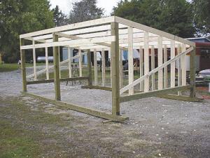 He uses 6 by 6 treated posts on all the building's corners (bigger sheds have an extra 6 by 6 at the middle on each side) for maximum strength. The 6 by 6's are notched at the top to accept 2 by 6's, which hold the sides up and also support the rafters. The side tin is applied horizontally. "These sheds are built strong enough to resist high winds," says Schweppe.
