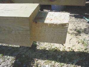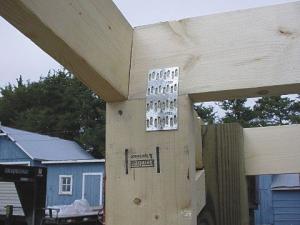 Angle iron brackets and 3 1/2-in. lag bolts are used to attach the 6 by 6 corner posts to the runners. "Recently, along with using angle iron brackets, I've been adding metal connector plates that simply hammer in place. A connector plate holds lumber together just as if they were laminated together," says Schweppe.