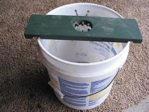 On the underside of the board, he cut slots 1/2-in. wide and 1/4-in. deep to fit over the rim of a five-gallon bucket.