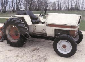 I redesigned the tractor to my liking and have used it around my farm for all these years. I also replaced the original 20 hp, 2-cyl. air-cooled engine with a 30 hp, 4-cyl. water-cooled model. I replaced the original hydrostatic transmission with a 3-speed transmission. I had to move the gas tank, originally located in front of the engine, behind the operator in order to make room for the radiator. The hood was then modified to make room for the radiator.
