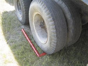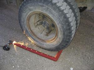 Gutschmidt lays the L-shaped guide down on the ground behind the back truck tire after he has successfully backed the truck up the first time. It also acts like a tire block so the truck can't roll back as easily.