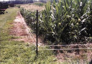 The Taylorsville, Ill., man grows one acre of sweet corn every year. He uses two strips of 1/2-in. wide electric tape, positioned at 6 and 10 in. off the ground. He uses an ordinary fence charger in his shop to keep the wires hot.