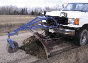 Hauner had been using the 7 1/2-ft. Western blade for years to plow snow off his driveway. But he didn't like the way it graded the driveway. "There was no way to regulate downpressure on the blade, so it would dig too deep into the gravel. A coil spring designed to protect the pickup frame from damage would hold the blade briefly and then release it. As the blade tried to recover, it started bouncing up and down, which resulted in the washboarding effect. My arched frame supports the blade and always keeps it at an even level," says Hauner. "Also, the caster wheel reduces blade resistance and keeps the pickup's front wheels from skidding when I turn."