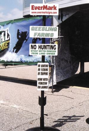 At $5.95 the 5 by 12-in. signs come with a big variety of standard phrases - "No Hunting," "For Sale," "Private Drive," etc. Blank signs cost $3.95, and come in a variety of colors, including the purple signs recognized as "No Trespassing" signs in several Midwest states.
