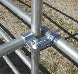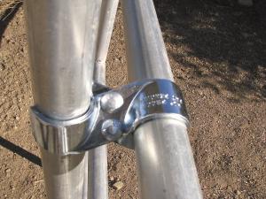 The pole clamp has a figure-8 twist that allows the connection of vertical and horizontal pipes. The versatile T-clamp offers an alternative to repair broken pipes as well as a variety of other uses such as adding pipes to the top of the corral for extra reinforcement.