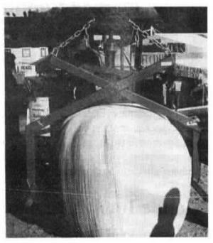 It hangs from a loader bucket by a pair of chains. A trip lever at center keeps the jaws of the handler separated as it's lowered down over the bale. A trip cord runs back to the operator so, when the jaws are in position to grab the bale, he pulls the cord and lifts the loader. To release, you just drop the loader to take the pressure off and swing it away.