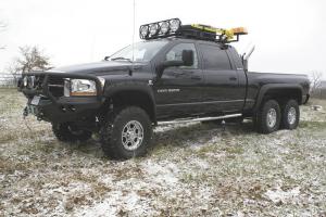 Although it has full-time power, Loughery emphasizes that the extra axle was done for looks, not for hauling heavy loads. The add-in axle is a corporate 14 center chunk (GM differential) with custom-made Dodge axle tubes. The transfer case is bolted to the front pinion of the GM differential. All other stock parts of major systems such as brakes are Dodge.