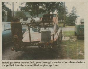 Dan starts the car on gasoline and switches over to wood-gas on the go. It takes about 8 min. to get a good fire burning. Levers inside the car control the amount of gas, air and wood gas that are drawn into the engine. On the highway, the Adastiks get about 1 mile per pound of wood.