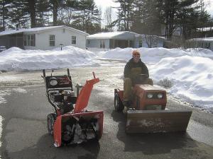 A friend of mine, Josh McWain, is responsible for all snow removal at a manufactured homes community in Greenfield, N.Y. He had a $1,000 8-hp. Tecumseh snowblower to use but found that his faithful old 3-speed Montgomery Wards lawn tractor does just as well with a home-built plow attachment on front. He made it by si