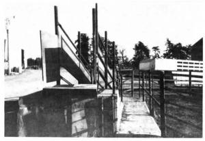 The 12-ft. long, 48-in. wide chute has shallow steps that are 12 in. long and 4 in. high. A concrete alley leads away from the ramp to a nearby holding pen.