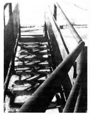 A steel panel welded onto each side of the chute keeps cattle from seeing out and trying to turn around. Posts on either side of the chute are 4112-in. in dia. Side rails on the chute and fence around the holding pen are made from 3 1/2 in. dia. oil field pipe, with rails made from 2 1/4-in. dia. pipe and 3/4-in. dia. sucker rod.