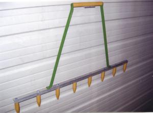 He used one of his old tractors, a Deere L with disc hillers on the cultivator, to make raised rows 30 in. apart. He made a planter out of square aluminum with 8 wooden points bolted on every 6 in. To make the points Sterling cut up an old hoe handle and turned the pieces on a lathe. They're mounted so they make 4-in. deep holes in the ground. He simply walked along and pushed it into the ground, placing the end point in the last hole to keep the row in line.